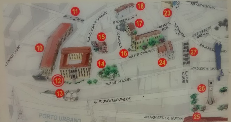 Existem fontes e monumentos construídos em homenagem a fatos e pessoas, todos com descrição.