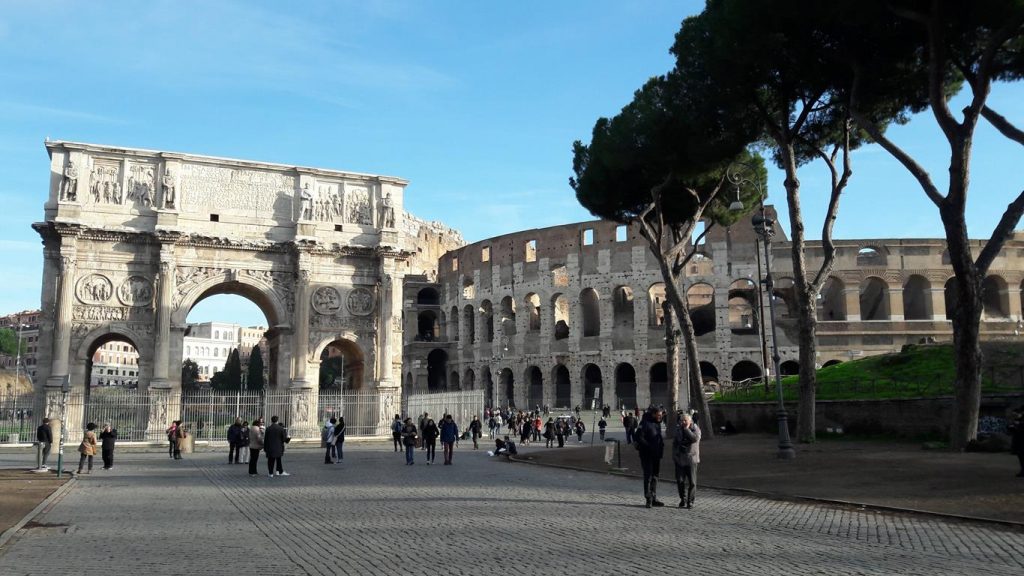 Antes de visitar o tão sonhado Coliseu, fizemos uma parada no Arco de Constantino construído pelo Senado romano em comemoração à vitória do imperador sobre Maxêncio, ou seja, na Batalha de Ponte Mílvia, em 312.